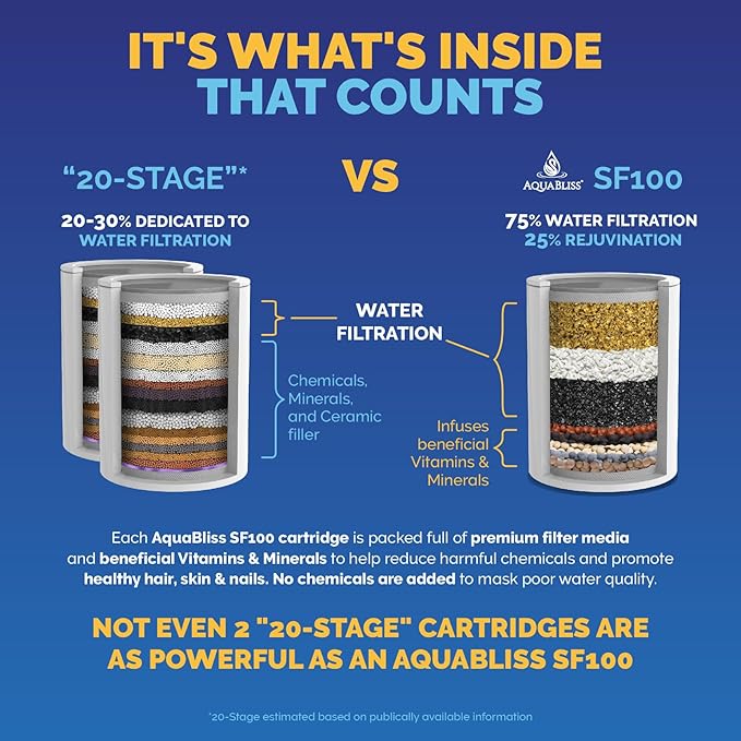 - JUST $0.09 CENTS/DAY: WHAT is your HEALTH worth? What about LOOKING YOUR BEST? If you’re a savvy shopper, you’ve done your research so you know that most shower filter cartridge options for well or city water only last a few months, then cost a pretty penny to replace. AquaBliss “EASY SWAP” showerhead FILTER replacements last longer cost less - for CLEANER, CLEARER, BEAUTIFYING SHOWER TIME for LESS than .09 cents per day.