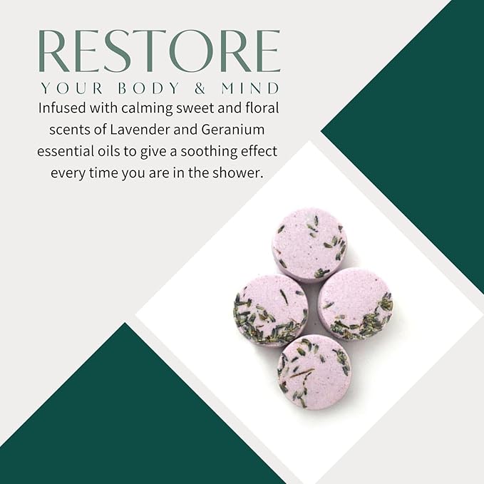 - RESTORE YOUR BODY & MIND: Our lavender shower steamer is infused with calming sweet and floral scents of Lavender and Geranium essential oils to give a soothing effect every time you are in the shower. Lavender helps to reduce stress and invigorates your senses. Its pleasant smell is a great way to enrich your environment that encourages you to relax, de-stress, and give yourself time to breathe!