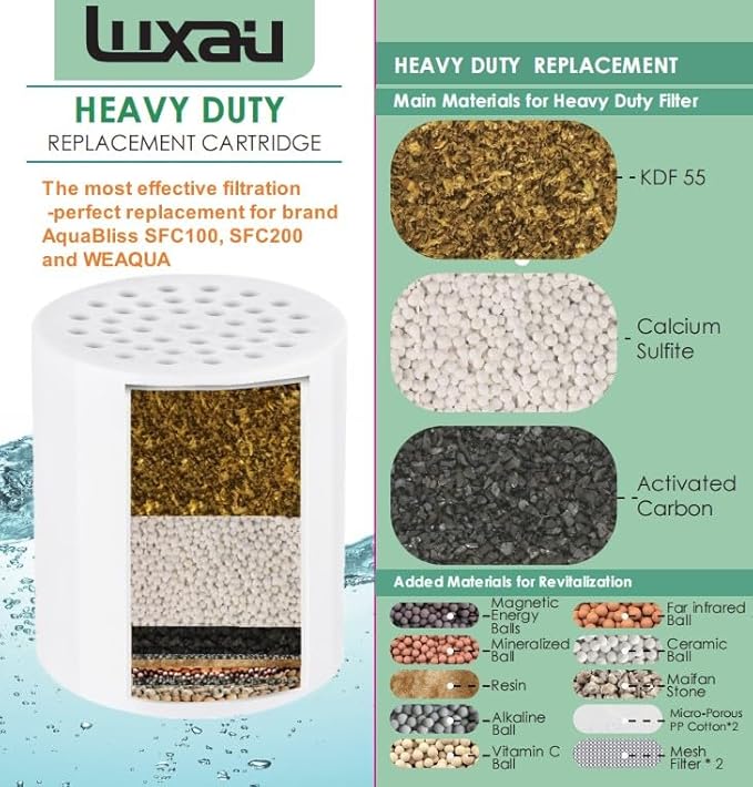 - 【Common Fitment】 this HEAVY DUTY filter replacement is common size, so it can fit any similar design shower filter shell (e.g.: fit for 10, 12, 15, 17, 18, multi-stage or 20 stage filter shell; replacement for brand Luxau, AquaBliss, AquaHomeGroup, SR SUN RISE, Cobbe, WEAQUA, AquaBLU, CASAHEAL, Laicky, Limia's Care, SparkPod, Aqua Earth, NearMoon, bwdm, FEELSO, EMBATHER, VeoryFly, Hopopro, HarJue, AISMIHO, Dwavele, etc. ).