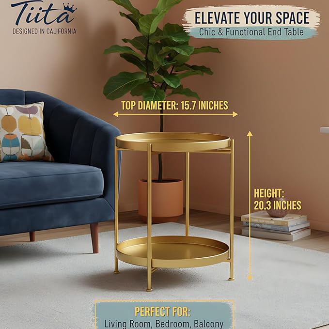 - Material : The 2-tier end table made of metal. The surface is smooth with fine coating. Simple and Space-saving.You can put books, coffees, laptop, photographs, small pot plants on it.(assembled 15.7W''*20.3''H)