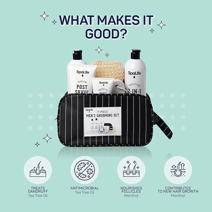 - LUXURY SPA AT HOME — Our 7-Piece mens skin care kit includes 2-in-1 Shampoo & Conditioner, Body Wash, Daily Moisturizer, Post-Shave Lotion, Bath Sponge, and Foot Stone, organized in a reusable toiletry bag, ensuring you have everything you need for a luxurious home spa experience.