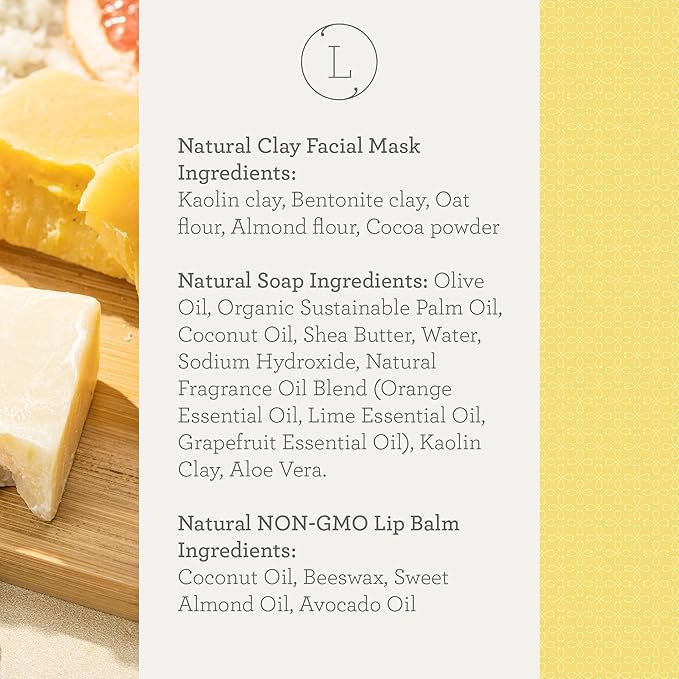 - COMPLETE 7-PIECE SET: Includes Citrus natural soap bar, Clay facial mask, Natural lip balm, Eye mask, Soap saver, Shower steamer, and a Scented candle – all elegantly arranged in a gorgeous gift box.