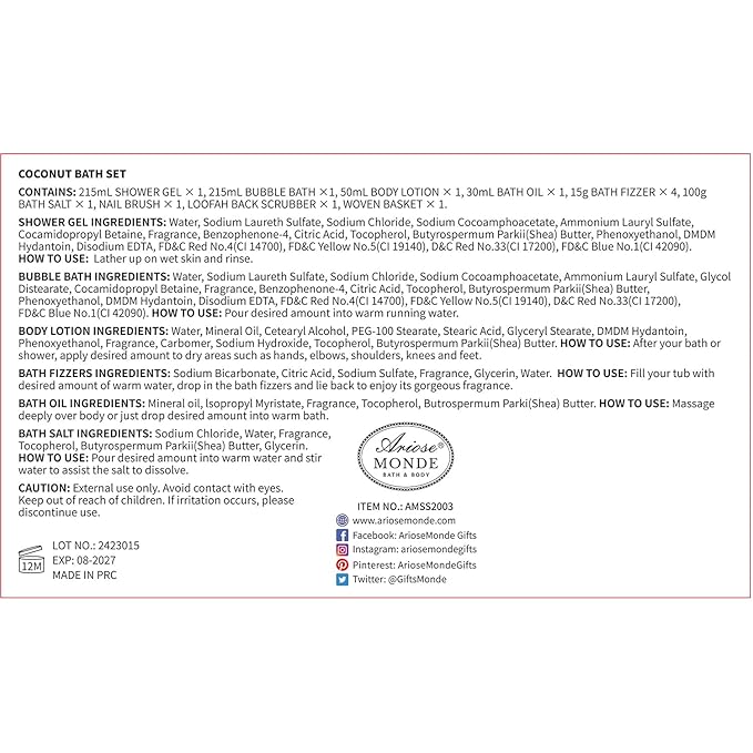 Bath & Shower Spa Basket Gift Set, Coconut Scent, with Shower Gel, Bubble Bath,Body Lotion, Bath Bomb,Bath Salt, Bath and Body Gift Box for Women