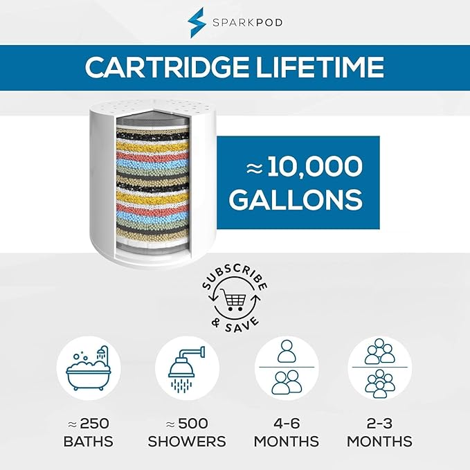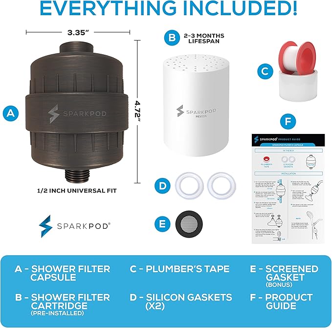 - By using SparkPod’s Multi-Stage filtration with high-grade Activated Carbon, KDF, Calcium Sulfite, Vitamin C and Mineral/Ceramic Balls, our Filter cleanses damaging particles