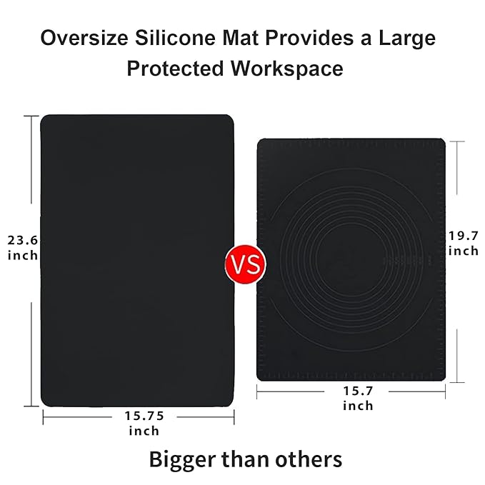 - 🍩【Safe Material】: 100% food-grade silicone, high quality. We are professional to offer food-grade silicone to you ! The black extra-large silicone mats are free of BPA, you can use them without any worry. Size 23.6x15.75 inches (60cm*40cm) each one. Our 2 pack black silicone mats are very large and convenient to use! 2 pieces included, the thickness is fine as it rolls up without any wrinkles. Available to cut the 2 pack black table mats to fit different sizes and shapes.
