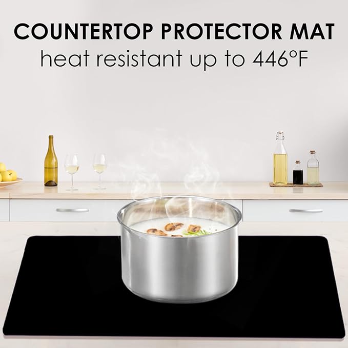 - 🍩【Heat Resistant Placemats Set】:The effective insulation of the 2 pack oversized table mats could reach to 446℉(230℃), can protect your dining table or countertop from heat containers. Please don't put the black silicone dinner mats near open fire. The black extra large mats can be curled or cut to your desired size. The black baking mats protect your countertop from pigment stains, glue, scratches, burns, grease, etc.