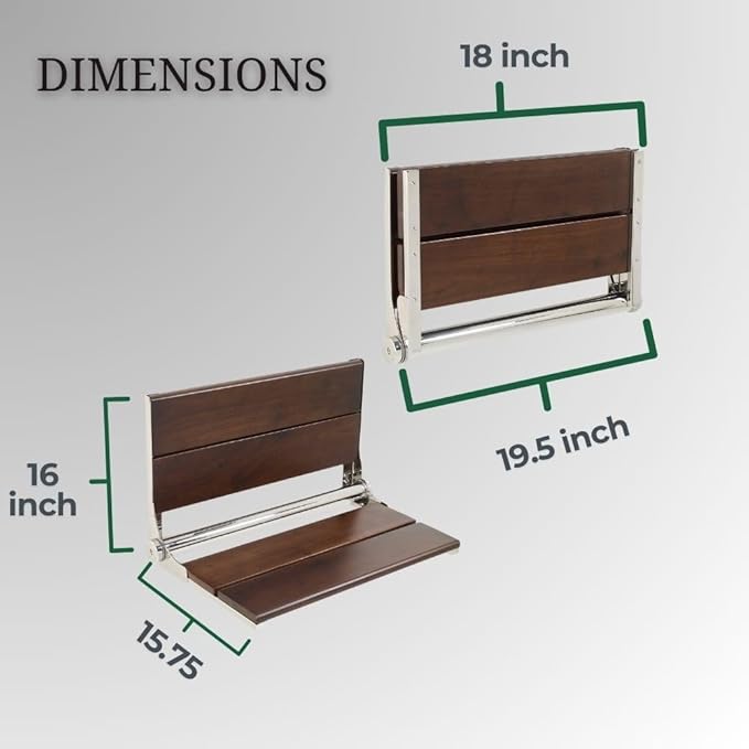 Folding Shower Seat Wall Mounted with Back | 500 lbs Maximum Load Capacity | ADA Compliant Safety Assist Teak Shower Seat for Seniors, Handicapped, and Children | 304 Stainless Steel Frame | 18” x 16”