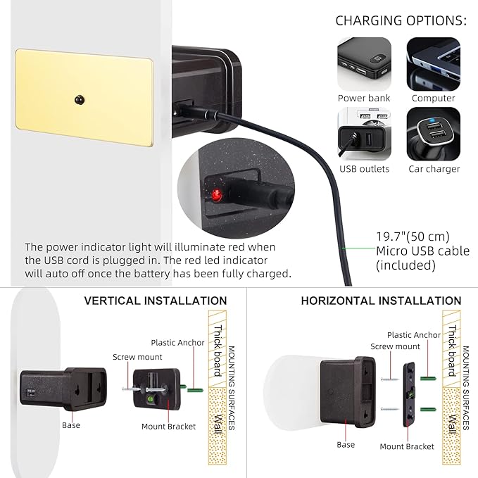 - [USB RECHARGEABLE] - The wall sconce is powered by built-in rechargeable polymer lithium battery which is 10000mA, full charged run time is about 23-25 hours.