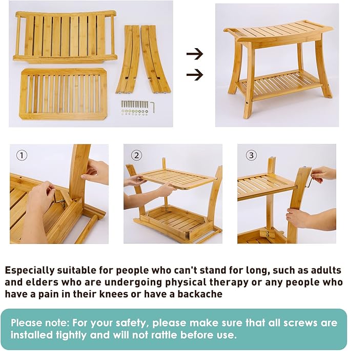 - MULTIFUNCTIONALITY & PRACTICALITY:The bamboo bath seat has 2-tier storage shelf,which can hold a variety of bath items and hanging your bathin towels. the handles on the sides of the seat let you pick it up more easily