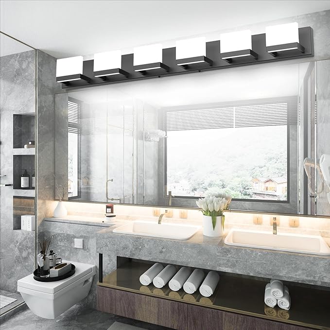 Tipace Dimmable Modern 6 Lights LED Vanity Light for Bathroom Up and Down Black Bathroom Wall Light Fixtures Over Mirror(White Light 6000K)