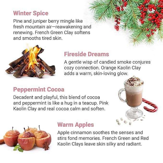 - Scent : Mistletoe Kisses, Peppermint Cocoa, Fireside Dreams, Warm Apples