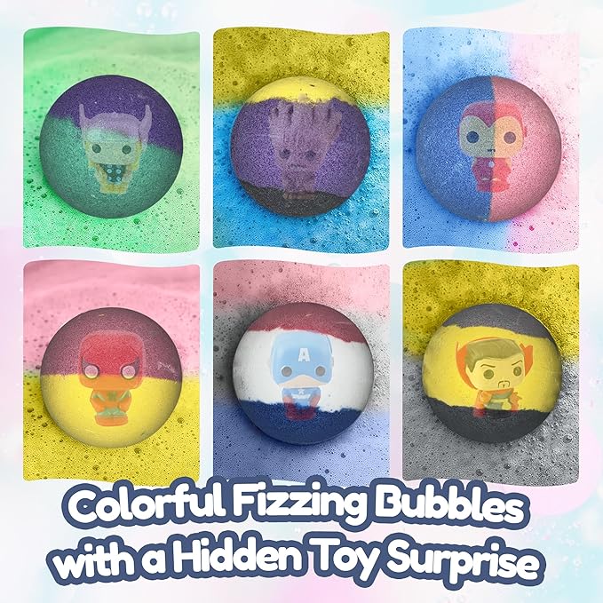 - Make Bathtime Fun - Have an epic superhero bath bombs adventure with 6 extra large superhero boy bath bombs with toys inside. These organic kids bath bombs for boys & girls are made from natural ingredients. Ideal sensitive skin bath bombs for kids.