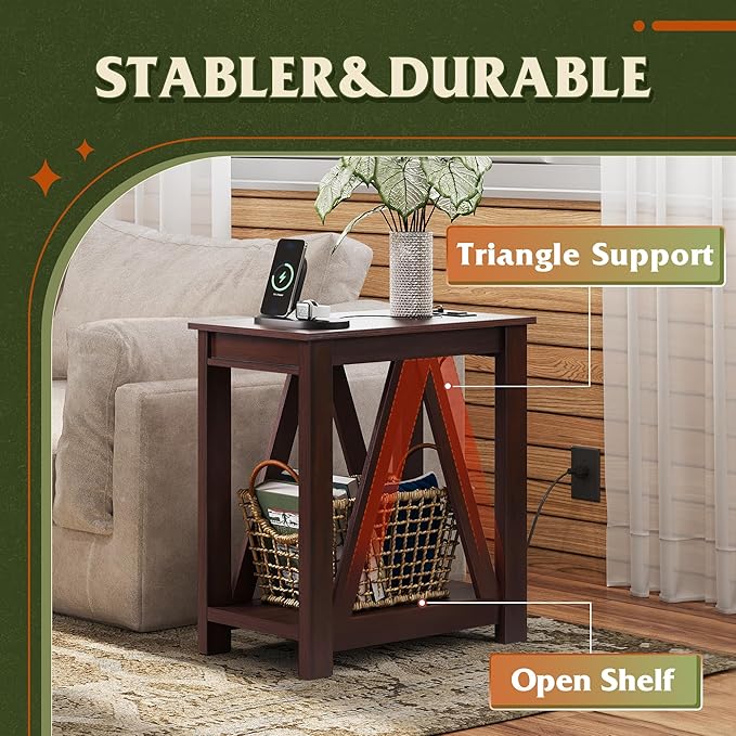 - 【Sturdy Structure and Intimate Design】The thick wood board and A-frame ensure stability and durability for years of use. Each leg of the side table is equipped with anti-slip pads, which will not scratch the floor. The weight capacity of the top is about 55 lbs, and the shelf is up to 44 lbs. This side table provides you with peace of mind.