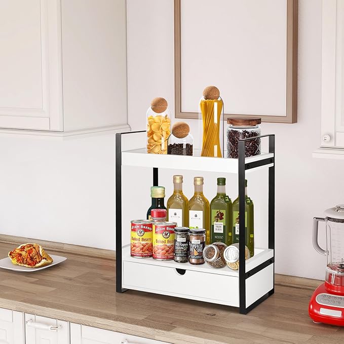 - 【Unlock Unlimited Possibilities by Bathroom Organizer】Not only perfect for bathroom, but this bathroom trays for counter can also be used in coffee bar, kitchen, living room, offiice or any other room where you need additional storage space. The size of countertop organizer is 13.2”L×6.9”×15.8”H, which is a perfect place to keep all essentials neat and tidy in the smallest possible space. Take control of your room organization with our 2-tier bathroom countertop storage rack with drawer.