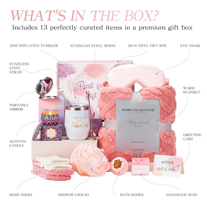 - Unboxing brings surprises:The exquisitely GIFT BASKET contains 13 items, including a bath ball, a handmade soap, an aromatherapy candle, a silk eye mask, a stainless steel coffee tumbler including straw, a cozy blanket, a pair of home socks, a portable mirror, a stainless steel spoon,a shower loofah and a card for your special message