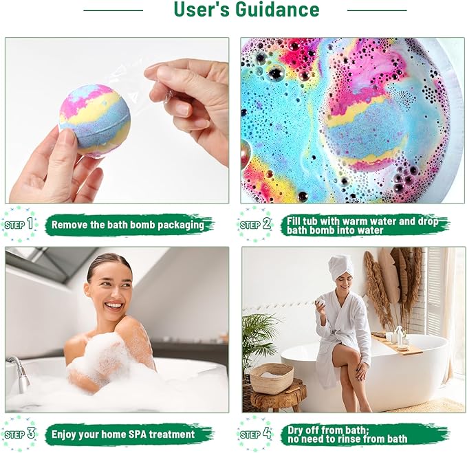 - [Gorgeous Colors] Our bath bombs are colorful and when placed in water bubble and fizz, filling the bath with colorful swirls. The color is made of natural plant pigments with no residue after use, so you do not have to worry about staining your bathtub. Note: Do not tear off the outer packaging film before use.