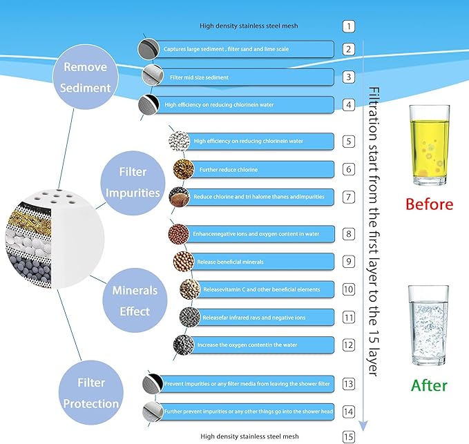 - HEALTH CARE SHOWER SYSTEM: Our cartridge has 15 stages of filtration for effectively reduces chlorine, heavy metals, fluoride, lime and scale in water.