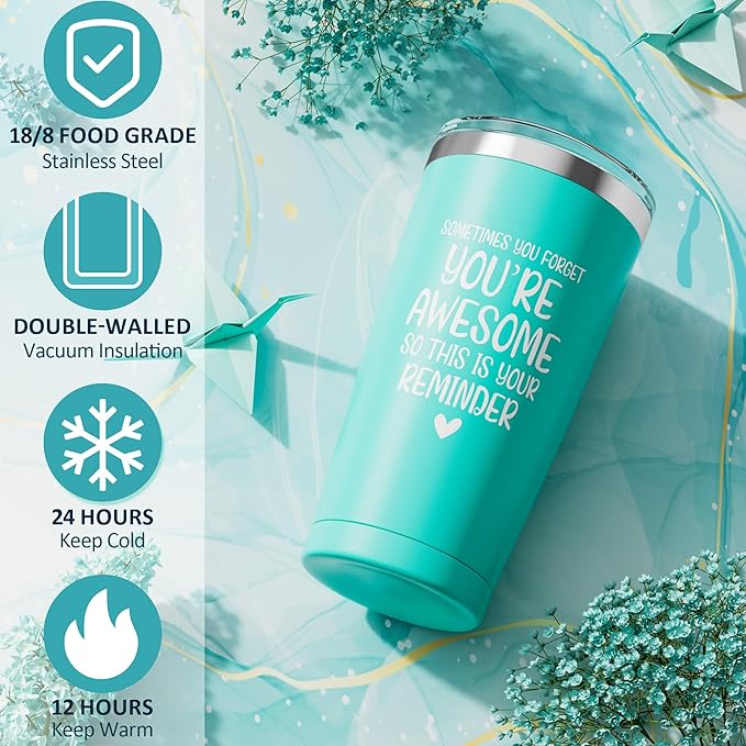 - INSULATED VACUUM TUMBLER: Made of 18/8 food-grade sturdy stainless steel, with double-walled vacuum insulation, this sweat-free insulated tumbler with lid can preserve beverage temperature up to 24h for cold & 12h for hot, great for iced coffee, tea, wine, juice, champagne, smoothies, sodas, milkshake, etc; "SOMETIMES YOU FORGET YOU'RE AWESOME...", encouraging quote printing boosts her confidence and brighten her days, making it an ideal relaxing gifts for her friendship gifts for women