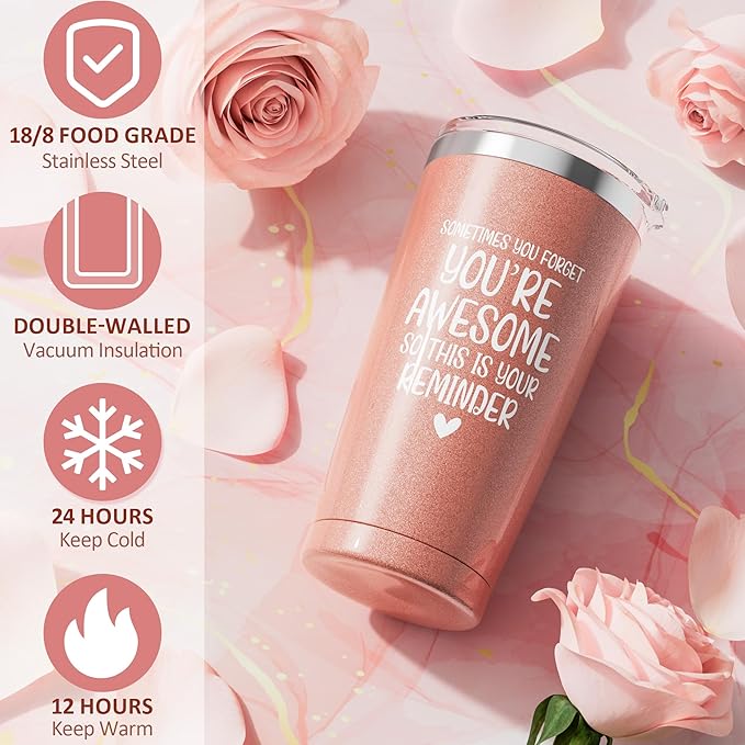 - INSULATED VACUUM TUMBLER: Made of 18/8 food-grade sturdy stainless steel, with double-walled vacuum insulation, this sweat-free insulated tumbler with lid can preserve beverage temperature up to 24h for cold & 12h for hot, great for iced coffee, tea, wine, juice, champagne, smoothies, sodas, milkshake, etc; "SOMETIMES YOU FORGET YOU'RE AWESOME...", encouraging quote printing boosts her confidence and brighten her days, making it an ideal relaxing gifts for her friendship gifts for women
