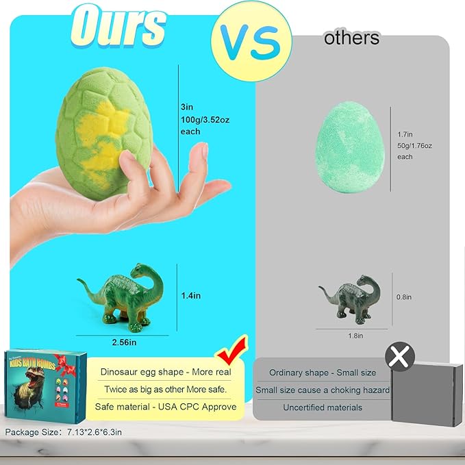 - 🦖【Bath Bombs with Toys Inside】Each bath bombs for kids contains a different dinosaur toy inside. Our dinosaur toys are made of safe material and also passed U.S. Toy Safety Testing for Kids Products. These dinosaur toys do not cause choking hazard and can also be used for collection, make children recognize ancient creatures and cultivate children’s imagination. So this bath bombs gift set will bring experience for boys and girls the best surprises when bathing time.A surprise choice for putting stocking stuffers in for the kids.