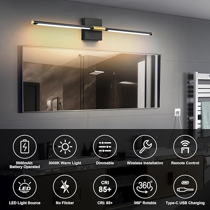 - 【Wide Application】Available in 24-inch and 30-inch sizes, this wireless battery wall sconce is ideal for use as a bathroom light fixture, vanity light, or picture light. The wall light can also be used in living rooms, bedrooms, hallways, dens, staircases, and for picture displays, making it perfect for home décor!