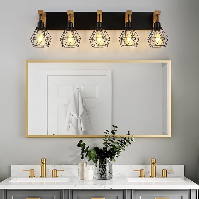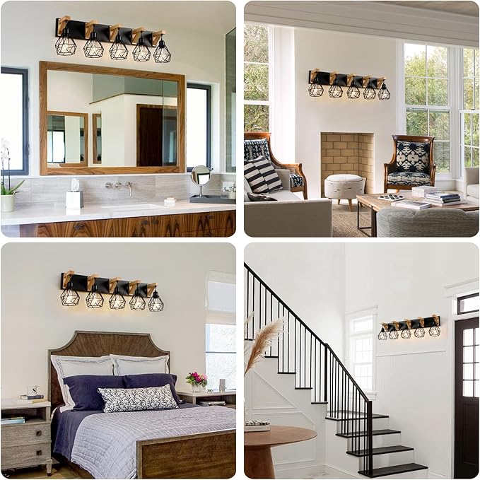 - šćEnchanting & Rustic Vanity Lightć- The farmhouse bathroom vanity light fixtures combine rustic charm with timeless appeal, creating a captivating lighting solution for your home. The wood accents and elegant metal lampshade add a touch of sophistication, transforming your space into a cozy retreat.