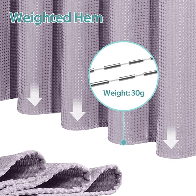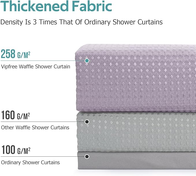 - High-Quality Polyester Fabric & Privacy Protection: Crafted from 258 GSM (grams per square meter) high-quality polyester fabric, it is fabric is thick yet allows good translucency, it is 1.12 pounds heavier than the 90 GSM fabric shower curtain. The added 30g weighted hem prevents the shower curtain from floating, ensuring enhanced privacy protection for you. The waffle weave pattern adds a touch of luxury and elegance to your bathroom