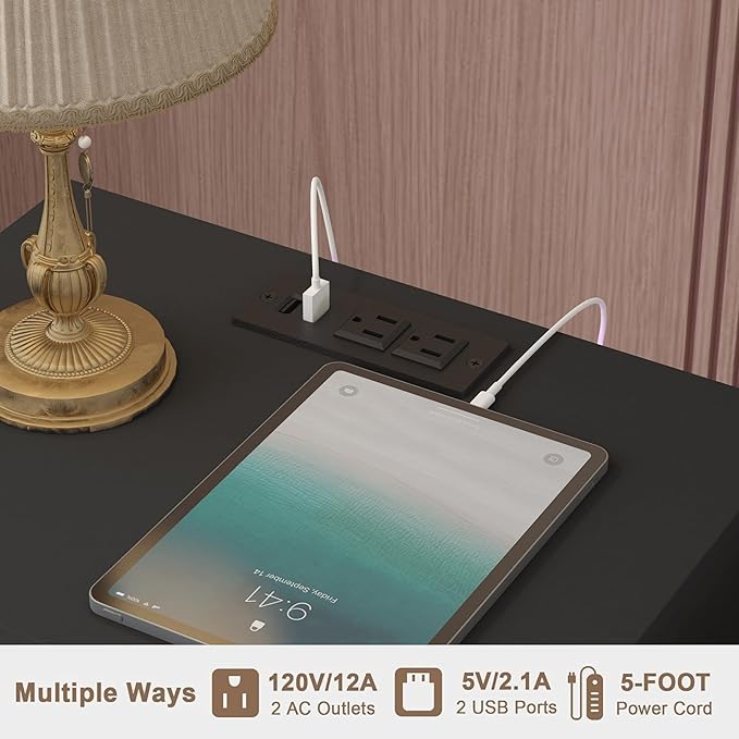 - Charge-Up Is Easy: Introducing the JOONEE small nightstand, the answer to outlet scarcity! With its two AC power outlets and two USB connections, this bedside table can meet all of your charging demands. Additionally, this modern nightstand's strategically positioned outlets charge numerous gadgets effectively and without disturbance.