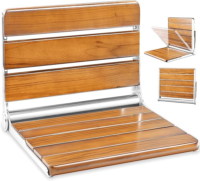 - 【Premium Teak & Heavy-Duty Stainless Steel Build】Constructed with Grade A natural teak wood and a 304 stainless steel frame, our folding teak shower seat wall mounted combines luxury with durability. The teak’s rich brown color and unique grain patterns add elegance, while the stainless steel frame ensures lasting support for up to 400 lbs.