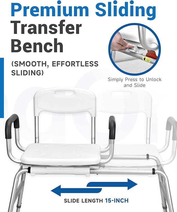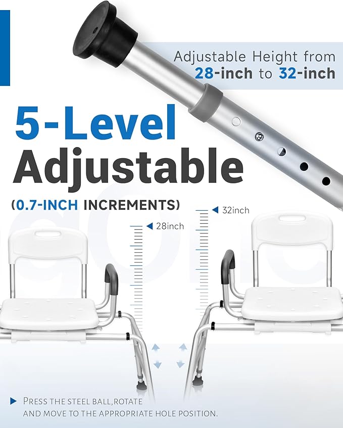 - TUBE TRANSFER BENCH WITH SWIVEL SHOWER SEAT: Making transferring to and out from your bathtube easier, this enlarged 17” by 14.5” shower seat swivels a full 360° in 45° increments, then locks in place for maximum stability. The nonslip seat is made with a lightly textured composite material that features multiple drainage holes to reduce slipping or sliding on pooled water for safe, comfortable seating.