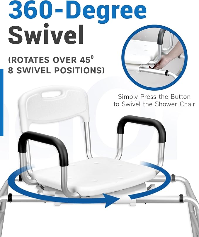 - SIT & SHOWER SAFELY: The shower chair is ideal for seniors, those recovering from injury or illness, our Sangohe swivel shower chair allows you to feel comfortable and secure when showering or bathing. The swivel shower seat supports up to 350 pounds and is ergonomically designed with a comfortable backrest and wide padded armrests.