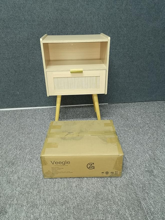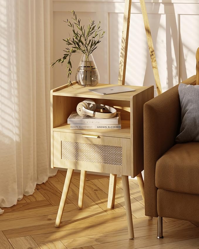 Rattan Nightstand,Modern Bedside Table with Storage Drawer and Open Wood Shelf, for Living Room, Bedroom and Small Spaces, Accent Night Stand with Solid Wood Legs, Easy Assembly,(Oak)