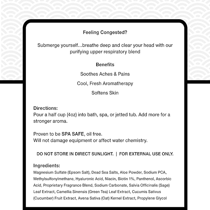 - FRESH, INVIGORATING SCENT PROFILE: Designed to pair perfectly with spa and hot tub sessions, this crisp aromatic blend helps create a clear, revitalizing soak using premium aromatherapy bath salts.