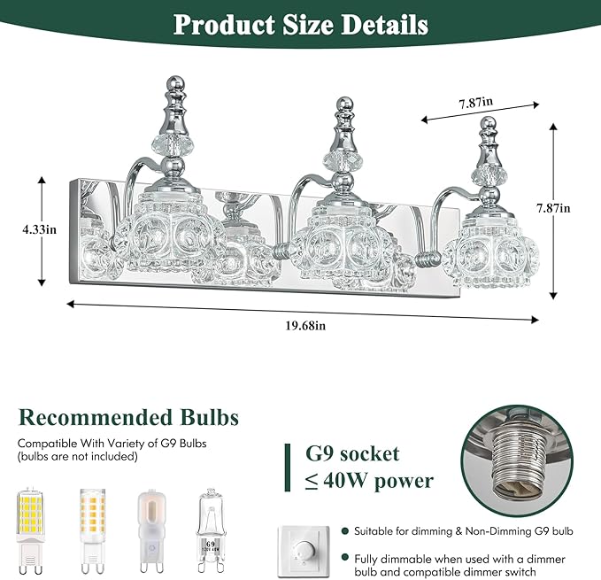 - 【Light Source】This vintage bathroom light fixtures requires 3 x G9 base bulbs, up to 40W, compatible with a variety of G9 bulbs. (Dimmable when using dimmable bulbs and compatible dimmer switch. Note:Not included)
