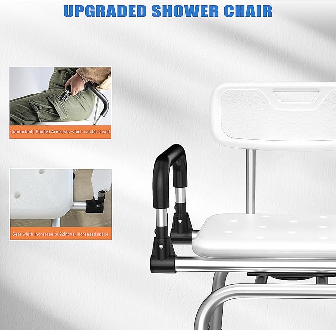 - Shower Chair with Handles: The armrests can be raised . Raising the armrests makes it easier to get in and out of the chair from any position. And the padded armrests give you greater comfort and support.