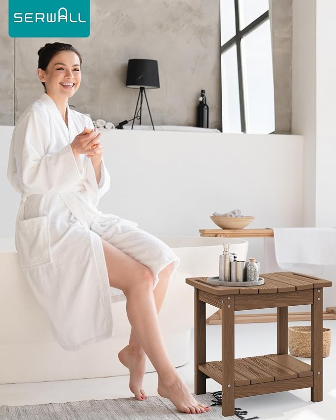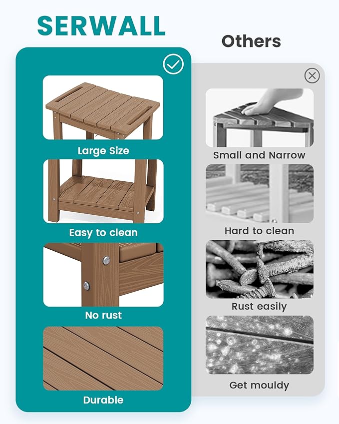 - 4-in-1 Multi-Usage: Designed for both indoor and outdoor use. The SERWALL waterproof shower bench can be used as: 1) shower seat; 2) outdoor bench; 3) side table; 4) Adirondack ottoman.