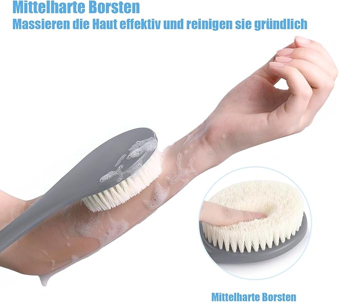 - Upgrade Moderate Bristle Firmness: The bristles on our back scrubber are just the right firmness,Too soft and they won’t effectively clean your skin, while too stiff can cause discomfort. We've chosen medium-hard bristles to ensure deep cleansing and a relaxing massage that’s gentle on your skin.
