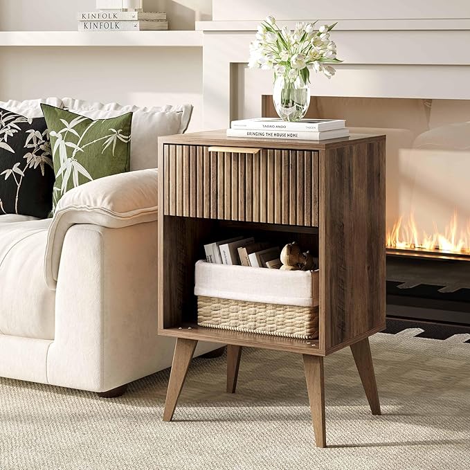 Fluted Night Stand with Opening Storage,Mid Century Bedside Table with Drawer,Wood Nightstand with Solid Wood Legs,End Table Side Table for Living Room,Bedroom,Caramel Oak CTG56BR