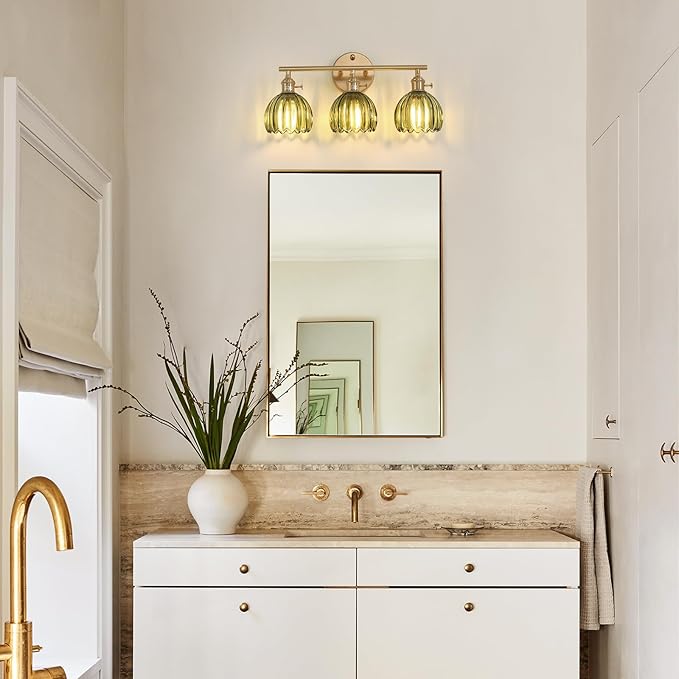 Bathroom Light Fixtures, 3-Light Brass Vanity Wall Light Over Mirror with Green Tulip Glass Shade for Bedroom Living Room (Bulb Not Included)