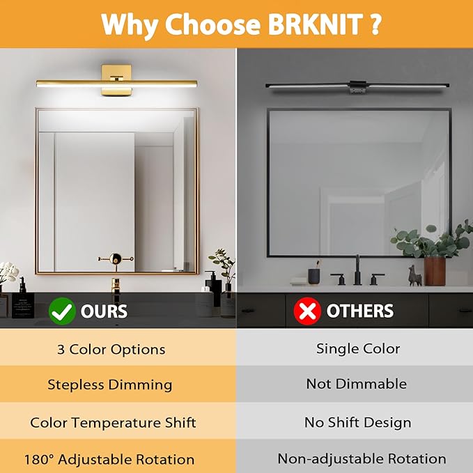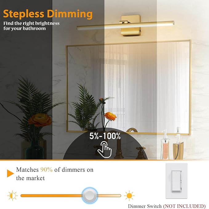 - 【3 Color Temperature Adjustable】Bathroom light fixtures upgrade 3 color temperature dimming (3000K/4000K/6000K), custom color temperature lighting, 5%-100% smooth dimming. Just swipe on one side of the box and feel free to choose warm white or cold white to satisfy your mood.