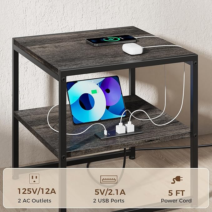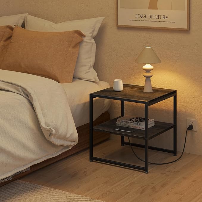 - Versatile Storage Design: This industrial end table with a charging station on the lower shelf keeps your tabletop clutter-free; its metal and wood finish suits living rooms or bedrooms as a nightstand or side table