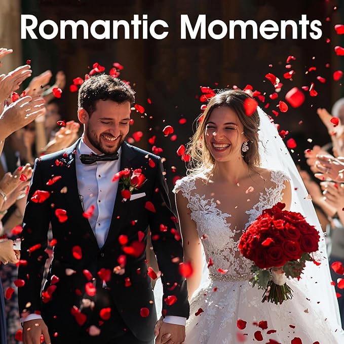 - Natural Red Rose Petals: Selected from fresh rose petals, they are fully soaked in glycerin and then dehydrated. This process preserves the softness and vibrant color of the real petals, giving them the same texture as fresh ones. They can be used as decorative petals for weddings. This product is not artificial rose petals; it is reusable and biodegradable confetti