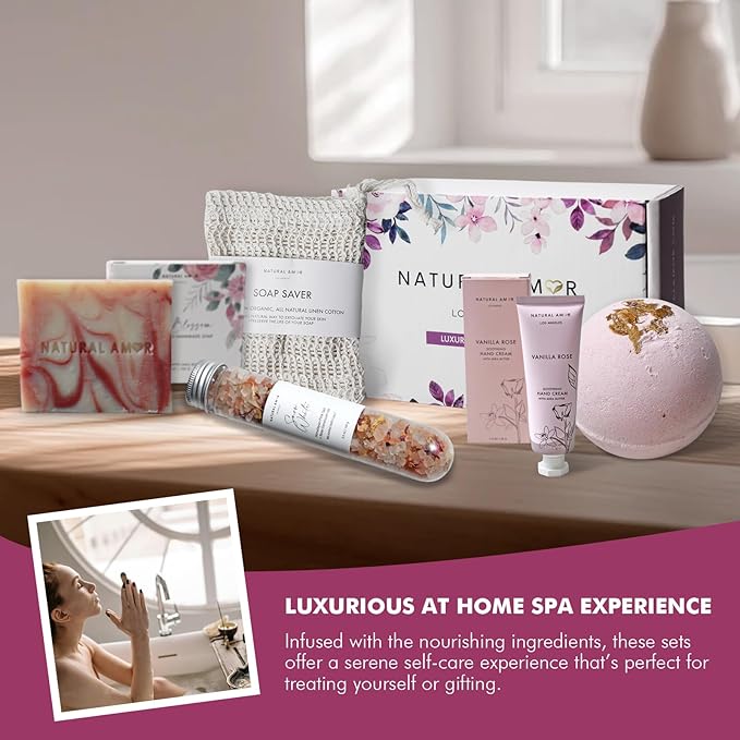 Rose Bath Spa Gift for Women,Handmade Spa gift for her, 5pc Bath & Body Gift Including Soap Bar, Hand Cream, Bath Salt, Soap Saver, Bath Bomb,Self Care Package by Natural Amor