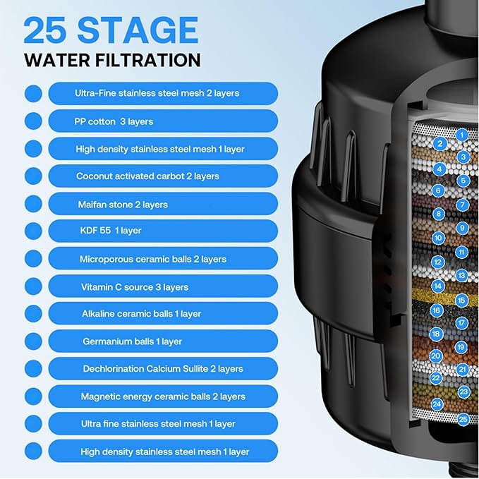 - 25-Stage Advanced Filtration System - AuileGco's advanced new filter for shower, incorporating core purifying ingredients such as KDF-55, coconut shell activated carbon and mineral/ceramic balls, is a fully upgraded enhanced filter that purifies water through 25 layers of progressive filtration.