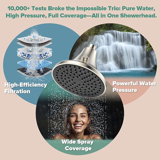 - High-Pressure Filtered Shower Head: After 10,000+ lab tests, we sucessfully solve this trilemma, which can combine high-efficient filtration for purified water, high-pressure technology for a powerful spray, and wide spray coverage for a full-body experience.Unlike traditional filtered showerheads that force you to compromise—where better filtration often means lower pressure, and increased pressure reduces spray coverage—our innovation delivers total purity, unmatched pressure, and superior performance for the perfect shower experience.