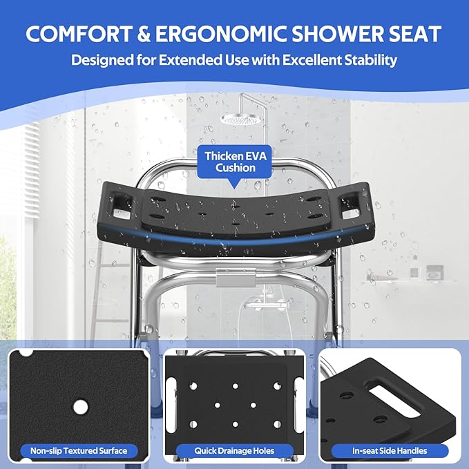 - SAFETY NON-SLIP TIPS - Bathroom safety is our top priority. Our folding shower stool features four robust rubber non-slip tips that create a secure suction, ensuring the chair remains firmly anchored to the ground. The strategically designed drainage holes allow water to flow out quickly, keeping the surface dry and comfortable while significantly reducing the risk of slipping. Enjoy peace of mind with every shower. shower chair for inside shower elderly and disabled