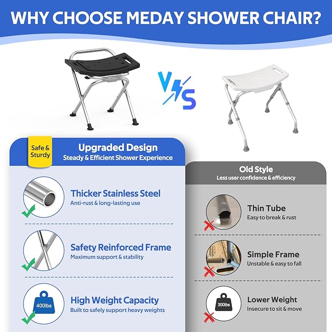 - STURDY & REINFORCED STRUCTURE - Say goodbye to worries about unstable shower stools! Meday upgraded folding shower bench is made of heavy duty stainless steel, capable of supporting up to 400 lbs without bending or breaking. Enhanced with reinforced frame, this bathroom seat provides unmatched stability and a 95% reduction in wobble than others, ensuring exceptional strength and reliability for your safety and comfort