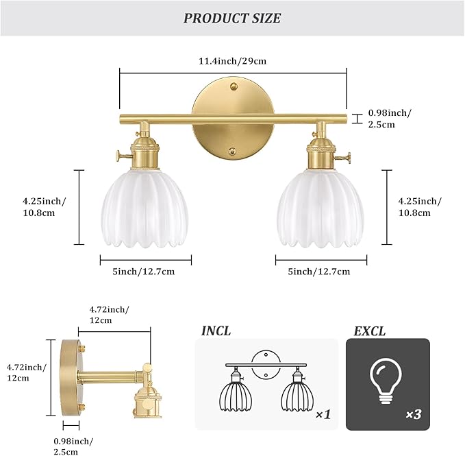 Bathroom Light Fixtures, 2-Light Brass Vanity Wall Light Over Mirror with White Tulip Glass Shade for Bedroom Living Room (Bulb Not Included)