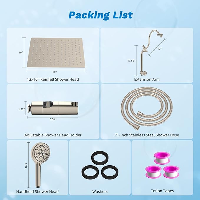 - [Enhanced 12" All-Metal Rainfall Shower Head] The all-metal 12*10 inch shower head crafted from high-quality stainless steel. It is designed to resist rust and ensure lasting durability. Its ultra-slim profile incorporates advanced air-in technology, providing a luxurious rainfall effect even in areas with low water pressure. Featuring 154 splash jets, it offers impressive coverage for an invigorating shower experience. Additionally, the brass swivel ball connector is adjustable, allowing you to tilt the shower head to any desired angle for an indulgent bathing experience
