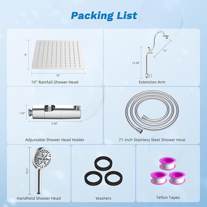 - [Enhanced 10" All-Metal Rainfall Shower Head] The all-metal 10*9 inch shower head crafted from high-quality stainless steel. It is designed to resist rust and ensure lasting durability. Its ultra-slim profile incorporates advanced air-in technology, providing a luxurious rainfall effect even in areas with low water pressure. Featuring 110 splash jets, it offers impressive coverage for an invigorating shower experience. Additionally, the brass swivel ball connector is adjustable, allowing you to tilt the shower head to any desired angle for an indulgent bathing experience